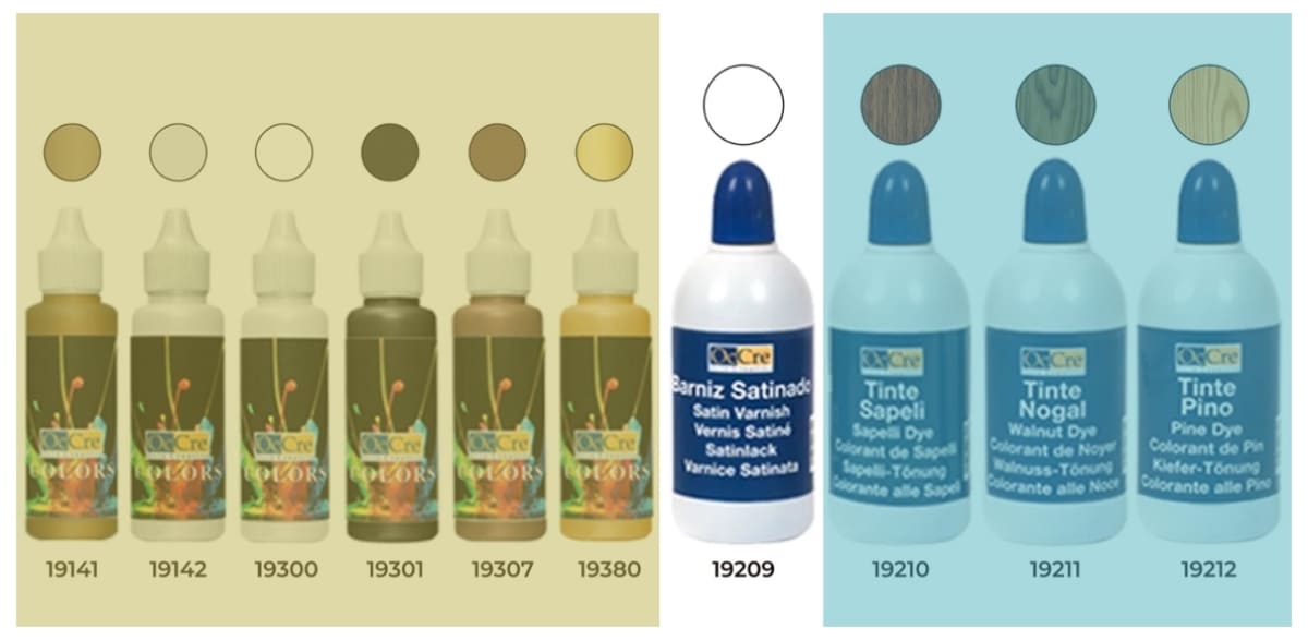 若您購買的是OcCre顏料組,如下淡黃色就是顏料,淡藍色就是染料,沒標記的就是保護漆(每組顏料組瓶數和標號不大一樣但長相差不多)