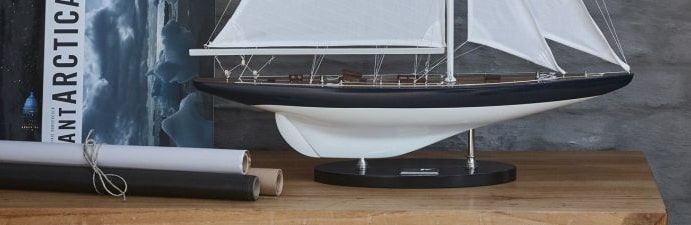Authentic Models(實究家飾) 生產的這款Rainbow號古典帆船,是很多歐美家居佈置不可或缺的品項;乾淨白帆、細膩縫線作工、現代風格及考究擬真甲板上索具配置是它整體特徵,配以銅製配件,真實製船工法 Plank-on-Frame(骨架上覆板) 設計,讓它名列收藏家金獎系列之一。