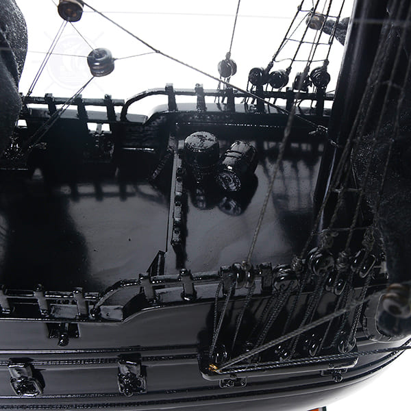 前桅上方是一面獨特的海盜旗,上面有骷髏符號和兩把相互交叉的刀片。在船的前後都可以看到金屬錨和木製方向舵。甲板上也有牢靠崁入的金屬駐紮的大砲、木屋、木樓梯、木桶等許多細緻的裝飾品。船尾還有一個細緻寢舍,亦有精美的手工金屬燈籠、設計獨特的舷窗和其他獨特的裝飾。