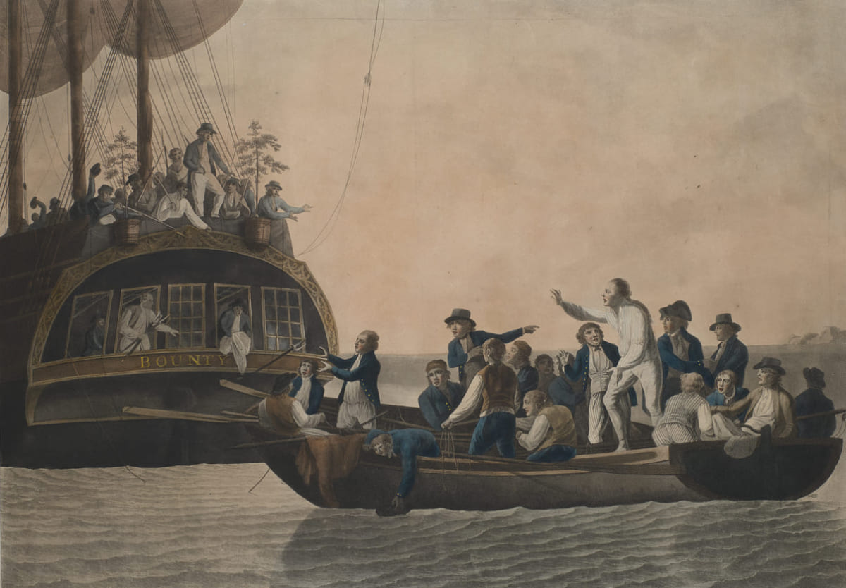 描述叛變船員將船長及其支持者放逐到小船上 – 於1790年由羅伯特·多德 (Robert Dodd)所繪