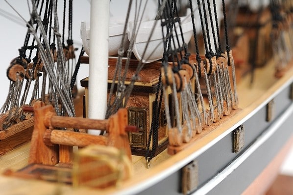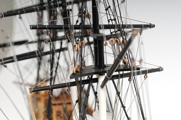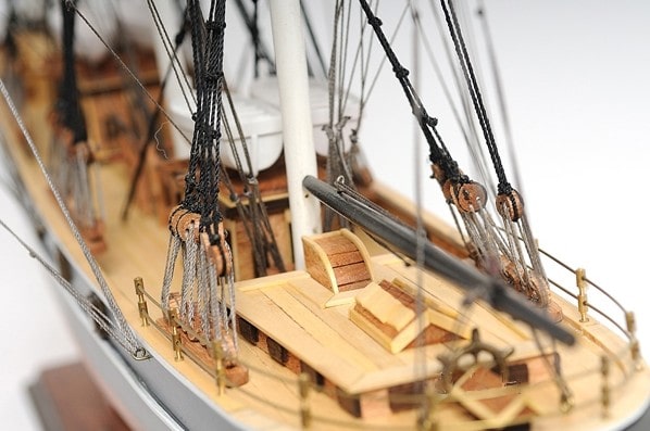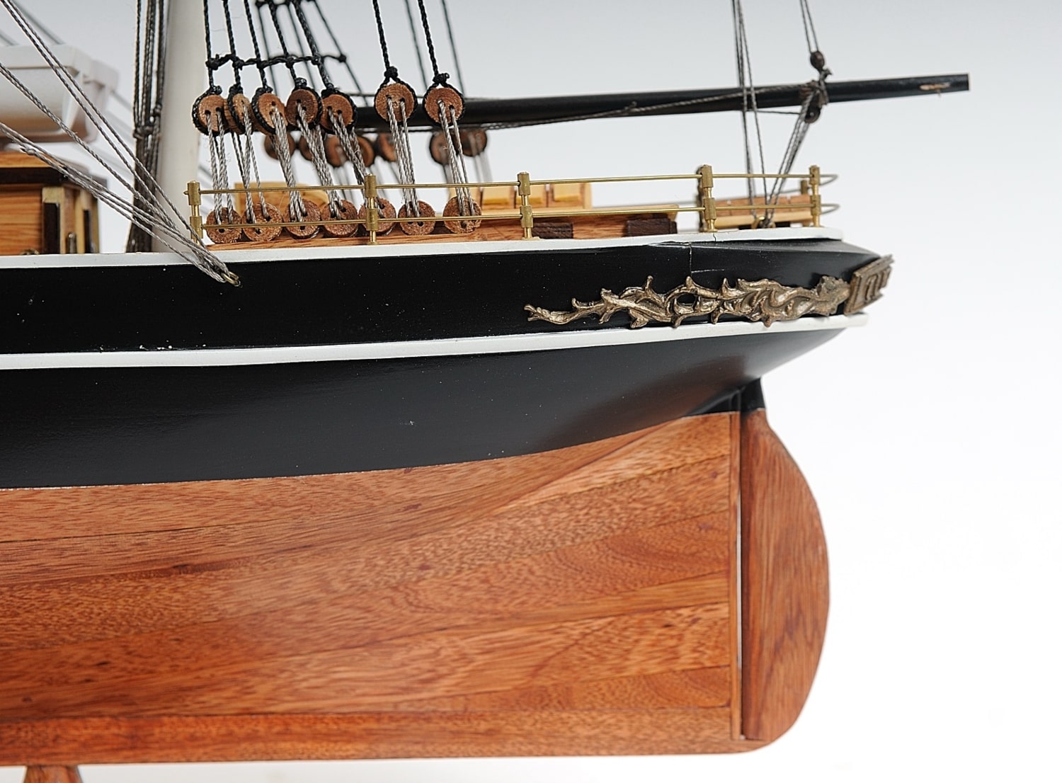 這個複刻品的細膩細節包括金屬錨和大砲、逼真的覽望台、精細複雜的索具、異色塗漆的船體、塗漆的桅杆、塗漆的救生艇、船頭和船尾上有刻印船名的黃銅配件、詳細的甲板構造等等。沒有塑料零件!採用實木底座,並帶有金屬銘牌。