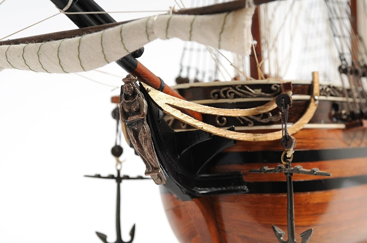 這艘 El Cazador 模型的船體上有一個獨特的雙條紋黑色油漆。它還有plank-on-frame、雙層甲板和船兩側的一排金屬大砲等特色。前斜桅和三個大桅杆使用精緻的索具牢固連接,繩索手工打結和固定。每個主桿都有一個由細亞麻布製成的手工縫製的捲起帆。在船的前後都可以看到金屬錨和木製方向舵。甲板上有金屬大砲、木間、木塔、木梯等許多手工飾品。此模型標配實木底座和黃銅銘牌。它將是送給家庭或辦公室裝飾者、船隻愛好者或收藏家的完美禮物。