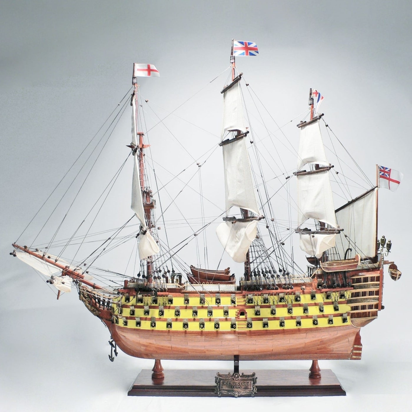 這個令人驚嘆的 H.M.S. Victory複製品勝利號手工模型船體上塗成黃色。它的特點是木框架施工、三層甲板,及位於船兩側的三排顯目的金屬大砲。船前斜桅和三個大桅杆使用複雜的索具牢固連接,繩索手工打結和固定,主桅上每個橫杆都有一個由細亞麻布製成的手工縫製的捲起帆。在船的前後都可以看到金屬錨和木製方向舵。甲板上擺放著擬真的帶肋骨和木製手工救生艇,駐紮的金屬大砲,金屬方向舵,木製起重架,船長的餐廳和臥艙,以及許多其他手工製作的裝飾品。船尾還有一個精緻細緻的海軍上將區,配有漂亮的金屬燈籠、手工製作的黃銅雕像和裝飾品,以及一根木製旗桿,標配實木底座和黃銅銘牌。