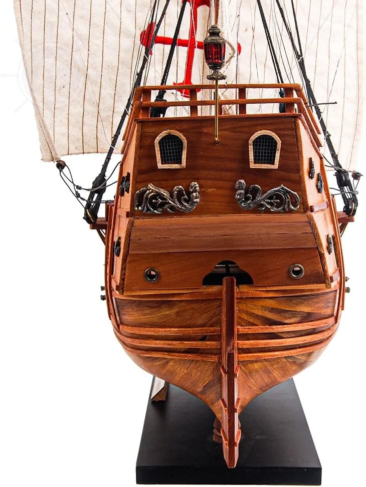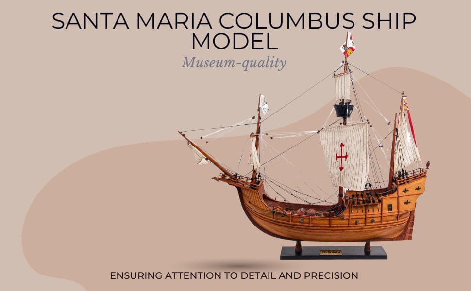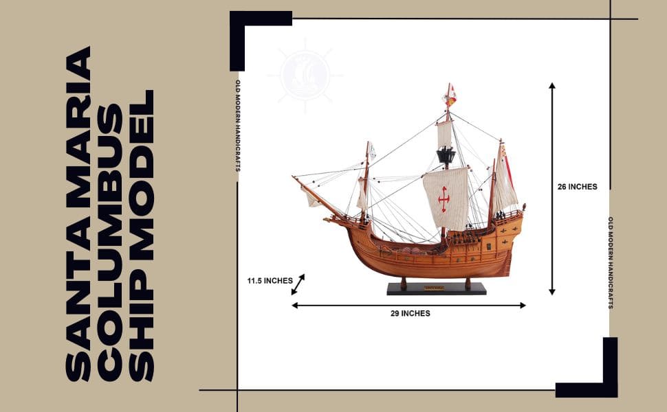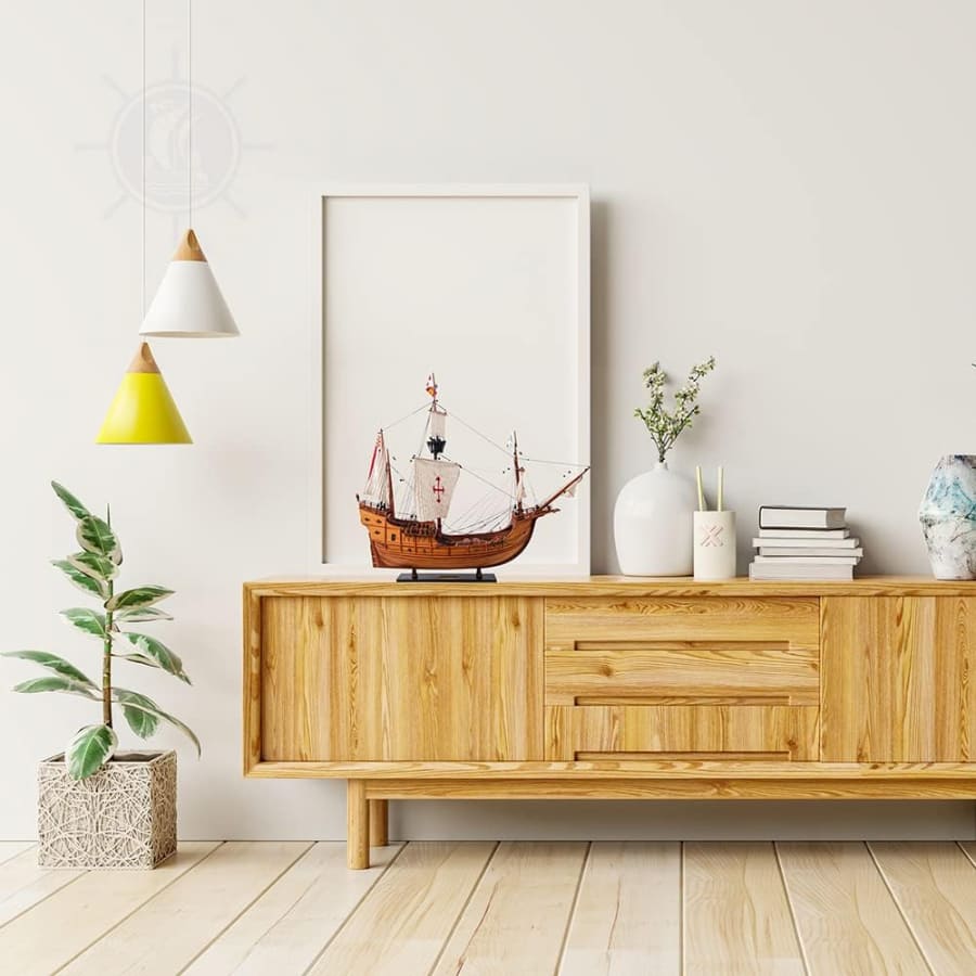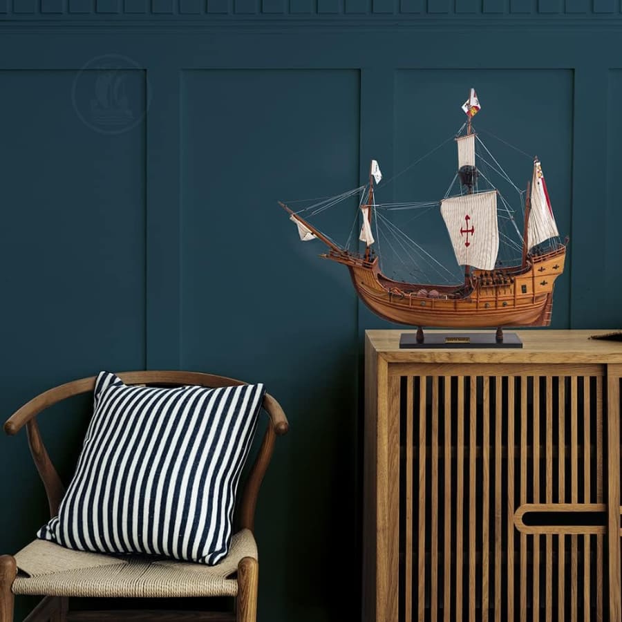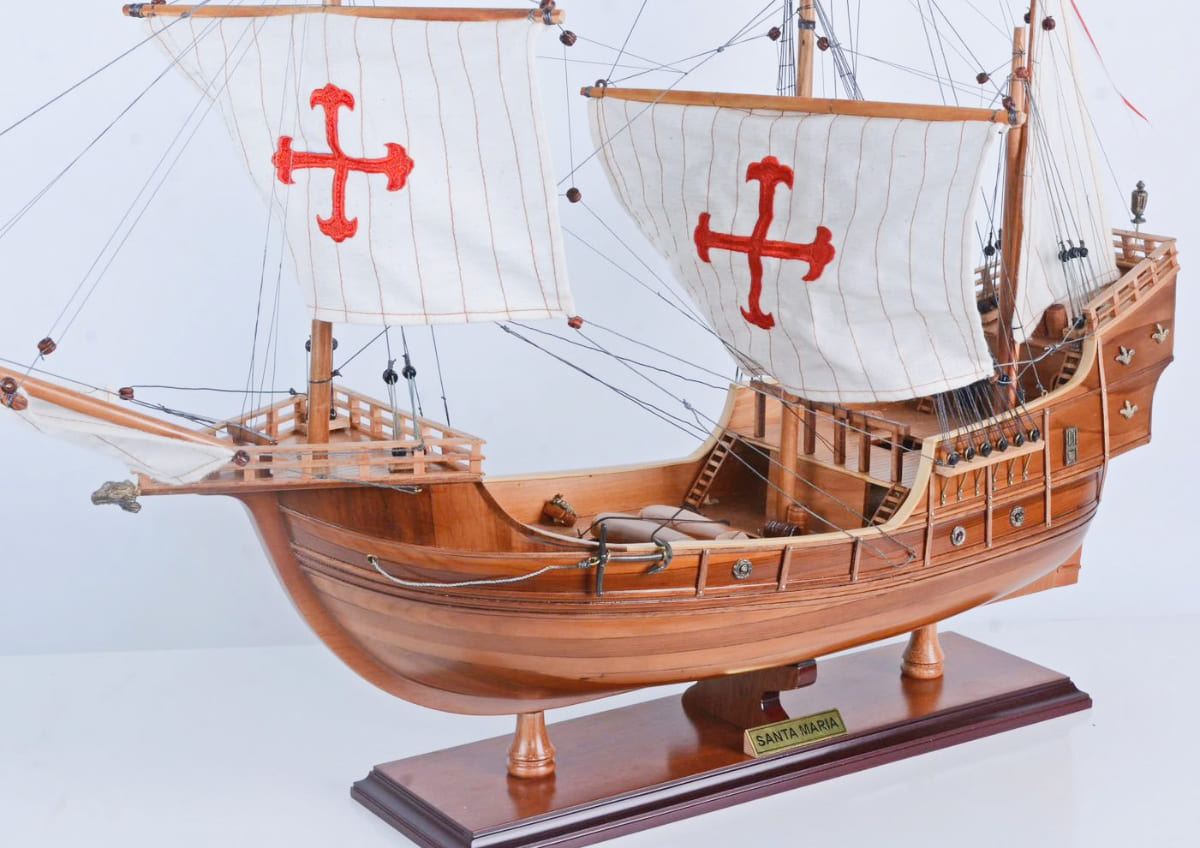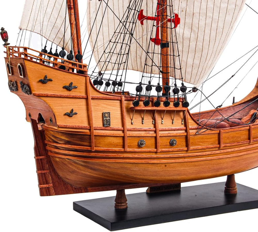 今天,您可以將這款獨特的模型帶回家中或辦公室!這艘聖瑪利亞號模型完全由木材製成,沒有任何塑料零件,採用類似真實造船的 Plank of Frame 框架結構製作。船首桅杆和三根主桅杆都用高品質繩索牢固連接,每條繩索都經過手工仔細打結並固定。每根桅杆上都附有由精緻亞麻布手工縫製的展開帆布。