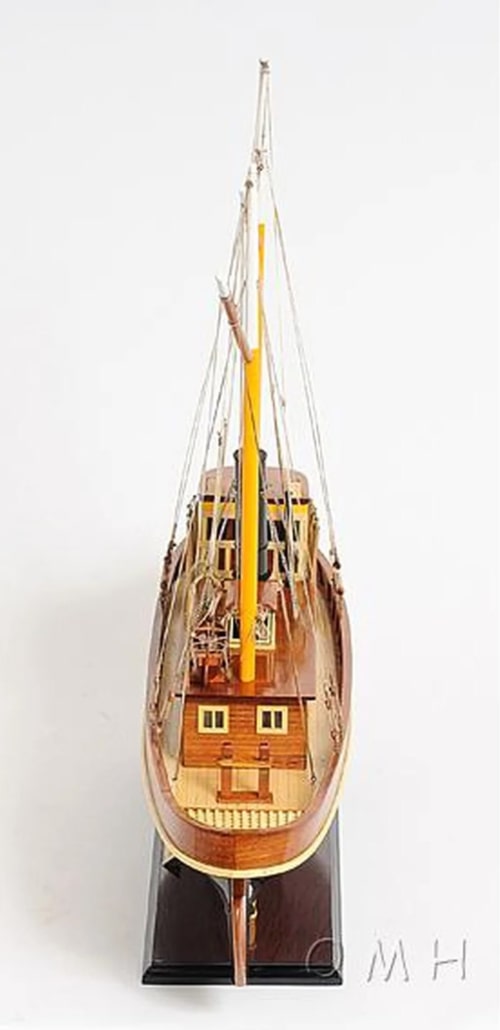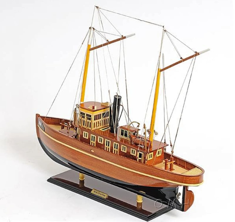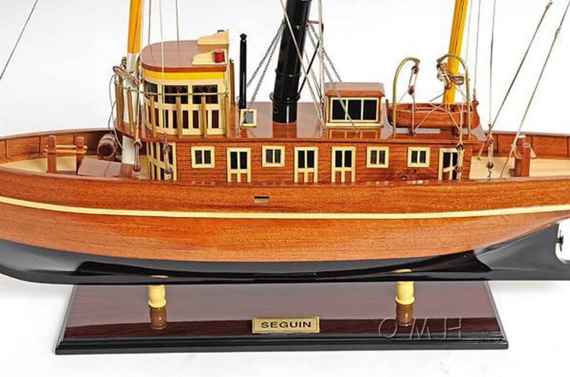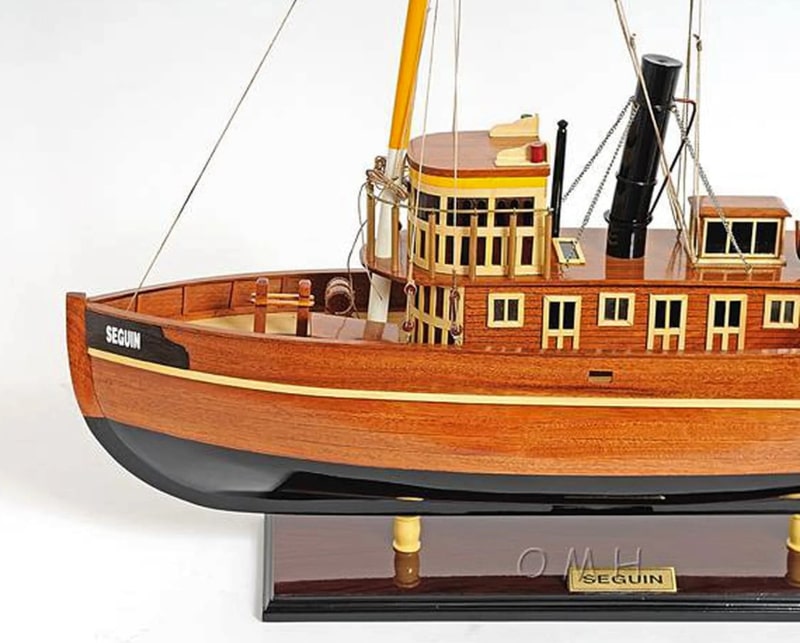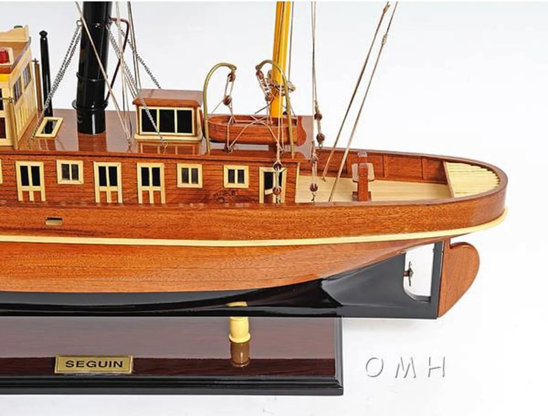 這個精緻的 Seguin 拖船模型是用桃花心木和柚木條100%手工使用類似實際造船 plank-on-frame 的方法建造完成。看看窗戶和甲板區域的所有讓人驚嘆的細節。所有的木飾條都很精緻的粘著,桅杆和煙囪以及船體下部都塗有接近真實的原始顏色,救生小艇也很細緻的綁縛著。船體表面透亮,使這個模型整體看起來非常漂亮。工匠們花了數十小時打造此模型並讓她完美呈現在您眼前,它的勤奮精神將繼續傳承為人所樂道。Seguin Tugboat 會是送給家庭或辦公室裝飾者、船隻愛好者或收藏家的完美禮物。