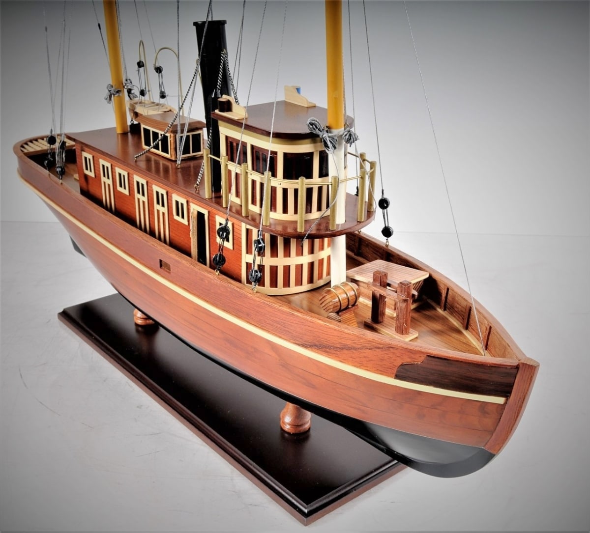 這個精緻的 Seguin 拖船模型是用桃花心木和柚木條100%手工使用類似實際造船 plank-on-frame 的方法建造完成。看看窗戶和甲板區域的所有讓人驚嘆的細節。所有的木飾條都很精緻的粘著,桅杆和煙囪以及船體下部都塗有接近真實的原始顏色,救生小艇也很細緻的綁縛著。船體表面透亮,使這個模型整體看起來非常漂亮。工匠們花了數十小時打造此模型並讓她完美呈現在您眼前,它的勤奮精神將繼續傳承為人所樂道。Seguin Tugboat 會是送給家庭或辦公室裝飾者、船隻愛好者或收藏家的完美禮物。