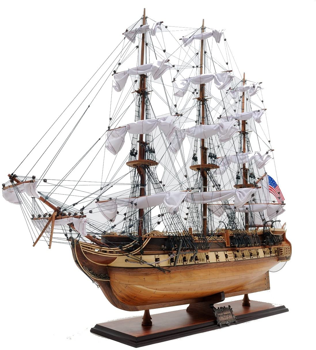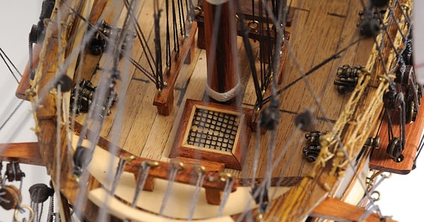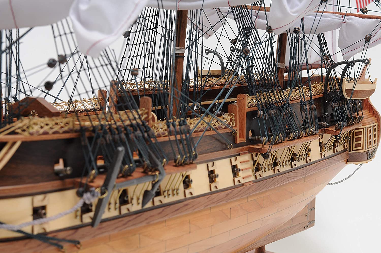 這艘令人驚嘆的 USS 憲法模型特點除木框架施工法外,雙層甲板和船兩側一整排兇猛的金屬大砲以及四層高的帆亦是主要特色。