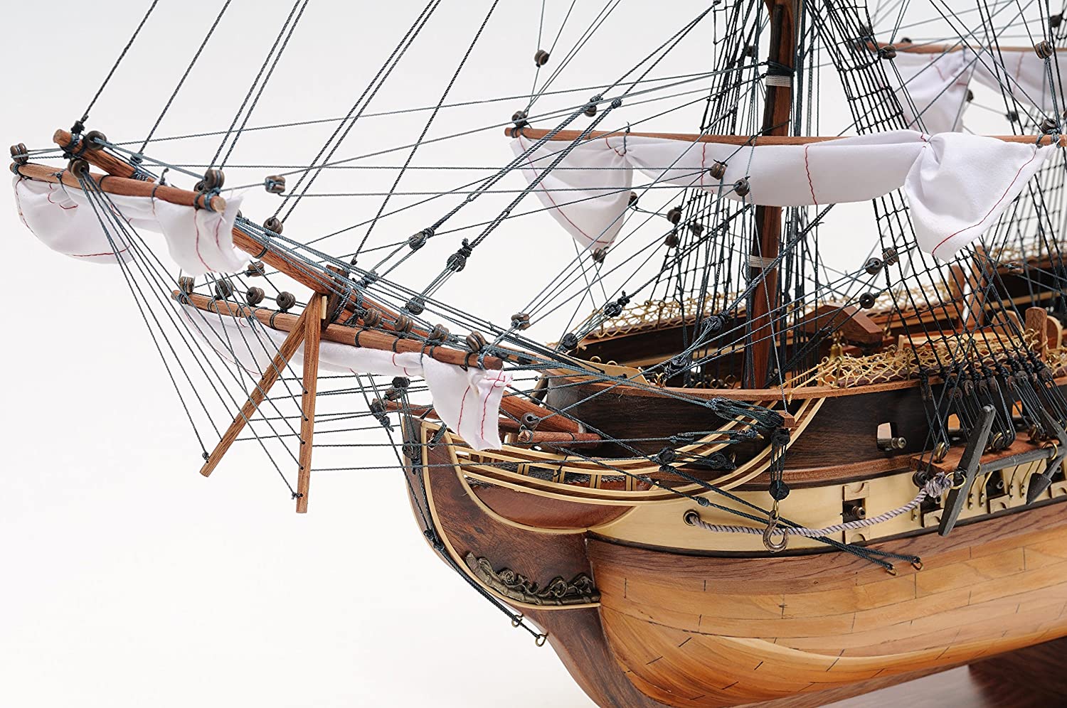 前斜桅和三個大桅杆使用先進的索具牢固連接,繩索以手工打結和固定。主桅上每個橫杆都有一個由細亞麻布製成的手工縫製的捲起帆,後方掛上光榮的美國國旗,在船的前後都可以看到金屬錨和木製方向舵。