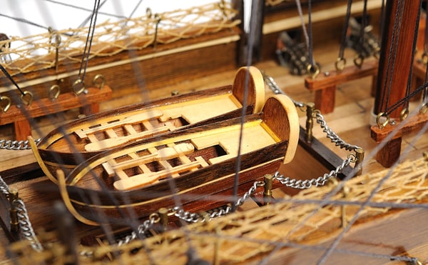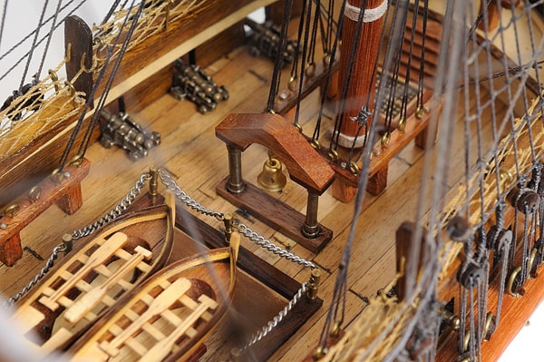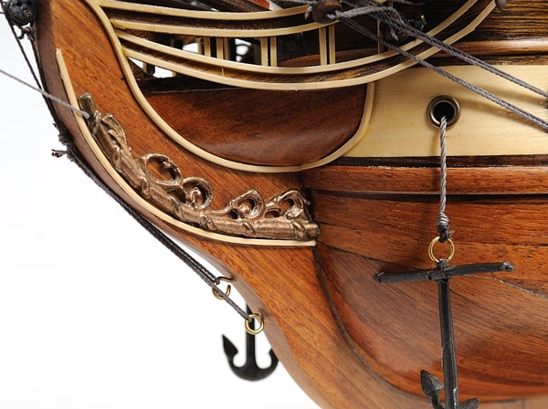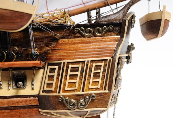 甲板上有逼真的帶肋骨木製救生艇,擬真金屬大砲、金屬方向舵、金屬鈴鐺、船長用餐和睡眠艙,以及許多其他手工製作的裝飾品。該模型完美矗立於實木底座上並有黃銅銘牌標示。