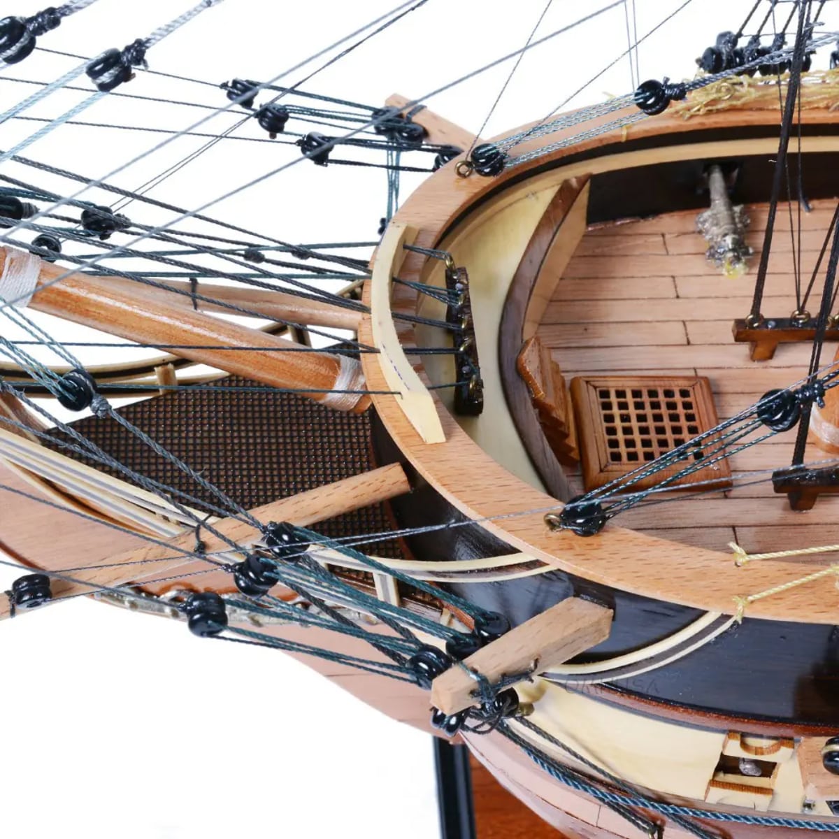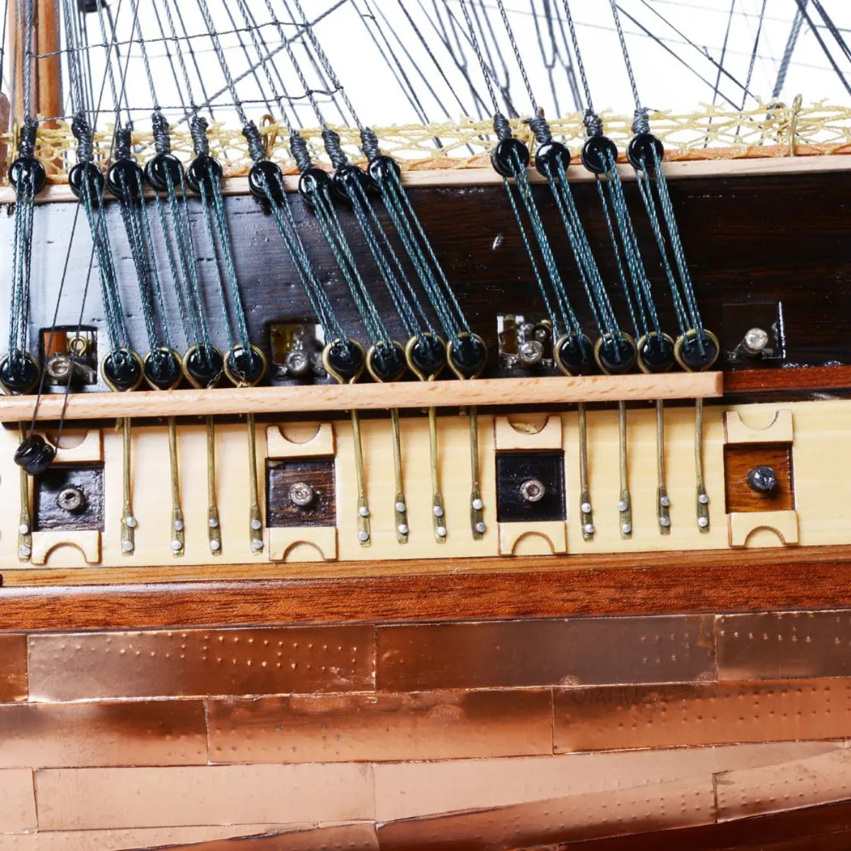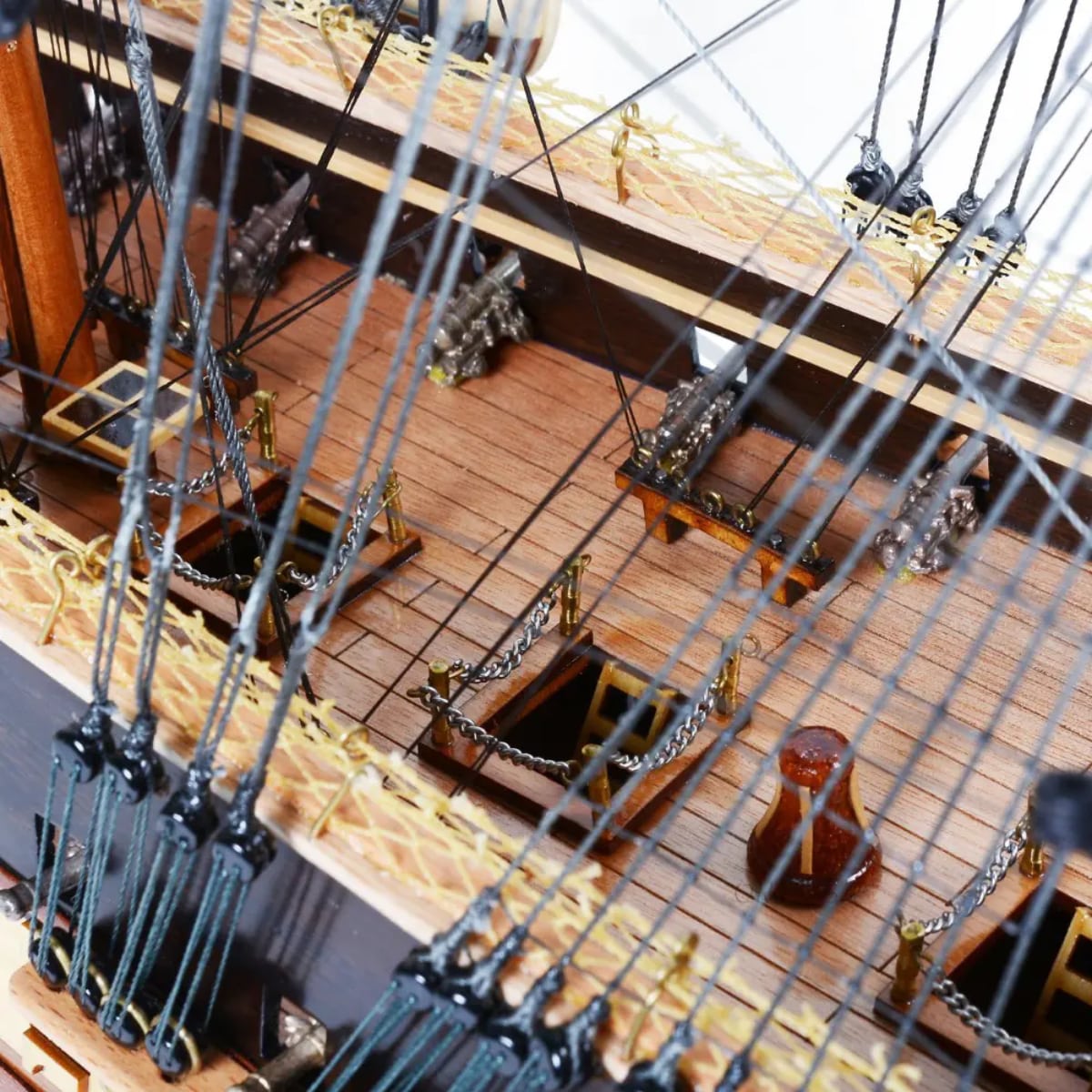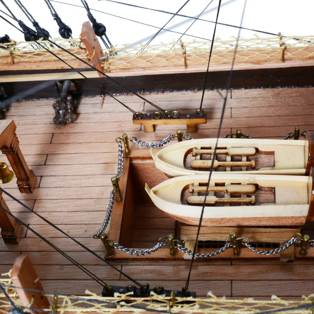 甲板上有逼真的帶肋骨木製救生艇,擬真金屬大砲、金屬方向舵、金屬鈴鐺、船長用餐和睡眠艙,以及許多其他手工製作的裝飾品。該模型完美矗立於實木底座上並有黃銅銘牌標示。